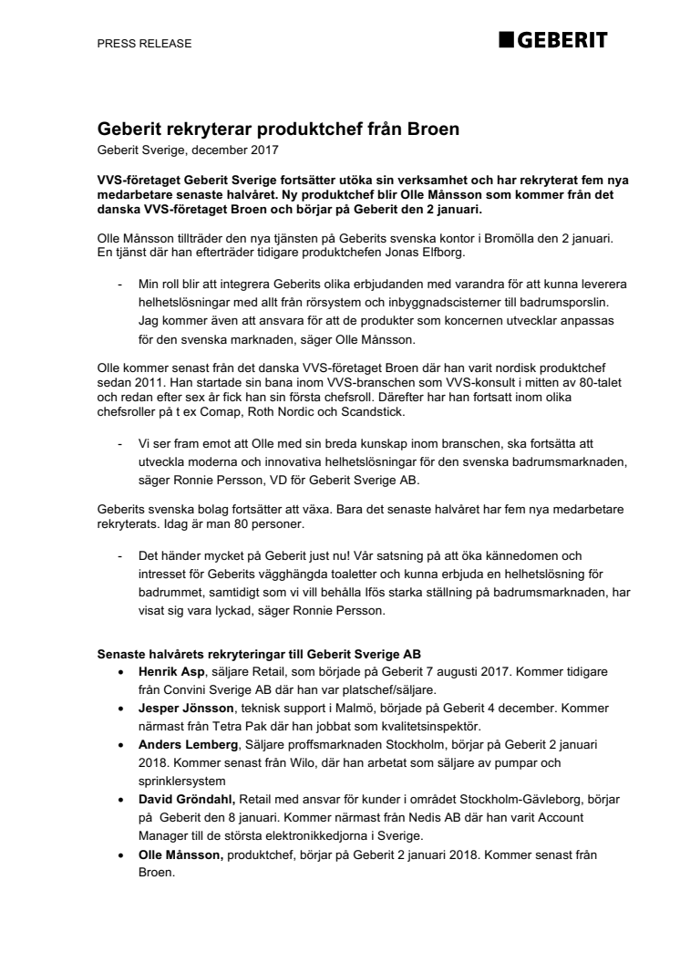 VVS-företaget Geberit Sverige fortsätter utöka sin verksamhet och har rekryterat fem nya medarbetare senaste halvåret. Ny produktchef blir Olle Månsson som kommer från det danska VVS-företaget Broen och börjar på Geberit den 2 januari.