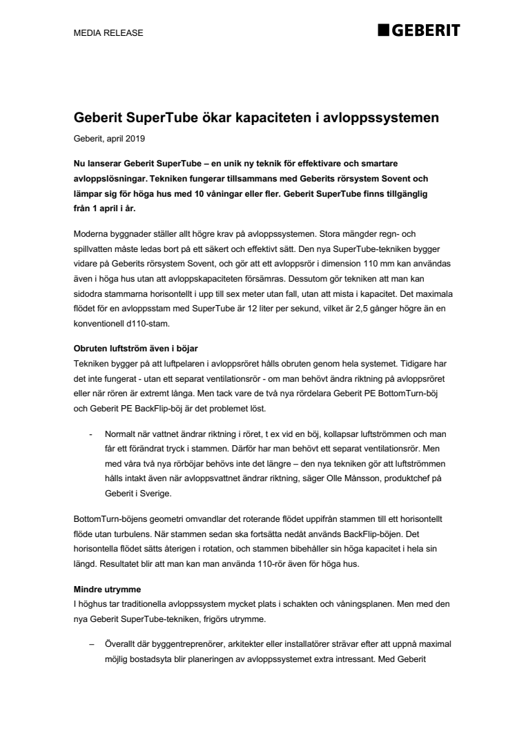 Nu lanserar Geberit SuperTube – en ny unik teknik för effektivare avloppslösningar. Den nya tekniken bygger vidare på Geberits rörsystem Sovent, och gör att ett avloppsrör i dimension 110 mm kan användas även i höga hus utan att avloppskapaciteten försämras. Dessutom kan man sidodra stammarna horisontellt i upp till sex meter utan fall. Tekniken lämpar sig för hus med 10 våningar eller fler.