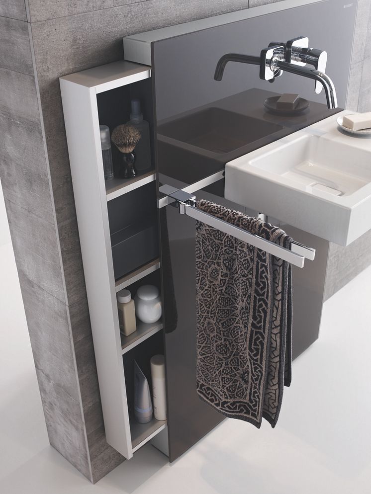Geberit Monolith tvättställ kombinerar stilren design med praktisk förvaring med plats för både krämer och handdukar.