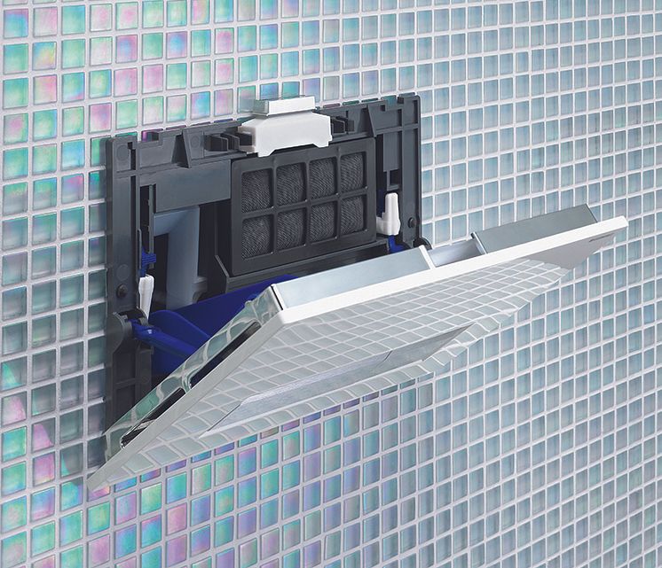 Geberits insats för WC-rengöringsblock ingår i spolplattan Sigma40. Du kan enkelt och säkert kan sätta in de praktiska WC-rengöringsblocken i den dolda cisternen för extra fräschhet och badrumshygien med varje spolning.