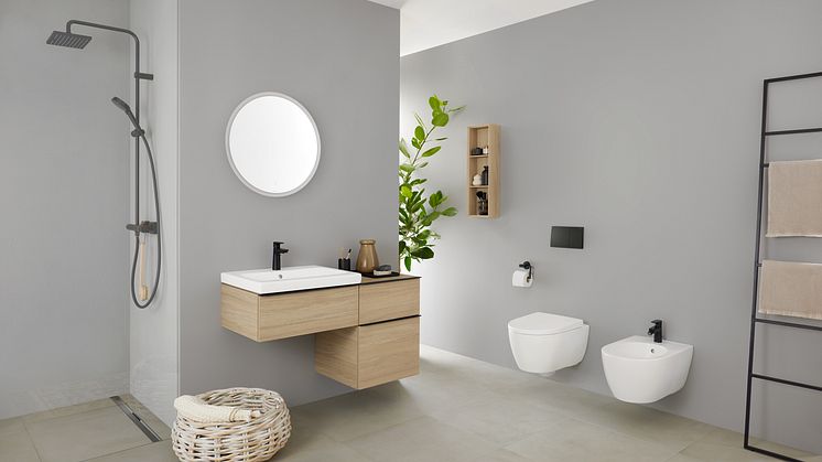 • 2023_iCon Bathroom with lay-on washbasin white matt, WC wall-hung white matt, Bidet wall-hung white matt, Option Mirror Round 60 light off_4_Original