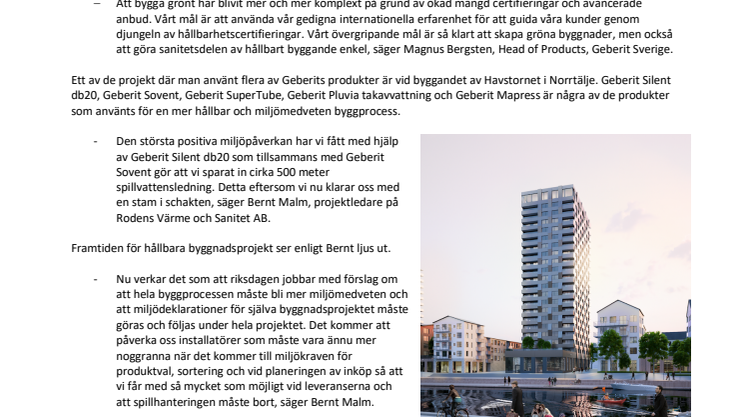 Ett av de projekt där man använt flera av Geberits produkter är vid byggandet av Havstornet i Norrtälje. Geberit Silent db20, Geberit Sovent, Geberit SuperTube, Geberit Pluvia takavvattning och Geberit Mapress är några av de produkter som använts för en mer hållbar och miljömedveten byggprocess.
