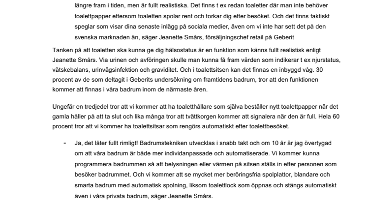- Vissa av de här funktionerna finns redan eller är på gång att utvecklas. Andra ligger kanske lite längre fram i tiden, men är fullt realistiska. Det finns t ex redan toaletter där man inte behöver toalettpapper eftersom toaletten spolar rent och torkar dig efter besöket. Och det finns faktiskt speglar som visar dina senaste inlägg på sociala medier, även om vi inte har sett det på den svenska marknaden än, säger Jeanette Smårs, försäljningschef retail på Geberit