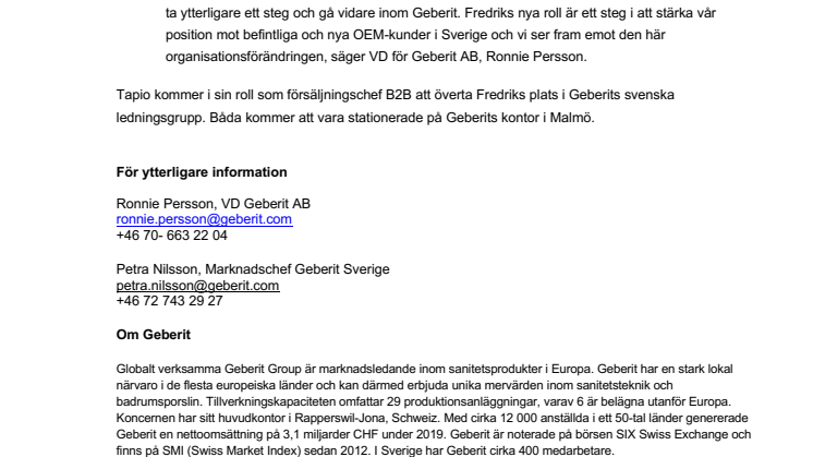- Tapio har tidigare varit regionchef för södra och västra Sverige och vi är väldigt glada att han vill ta ytterligare ett steg och gå vidare inom Geberit. Fredriks nya roll är ett steg i att stärka vår position mot befintliga och nya OEM-kunder i Sverige och vi ser fram emot den här organisationsförändringen, säger VD för Geberit AB, Ronnie Persson.