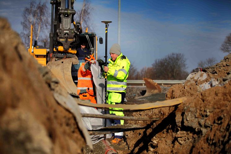 Geomatikks fälttekniker markerar var ledningsnäten ligger i marken.