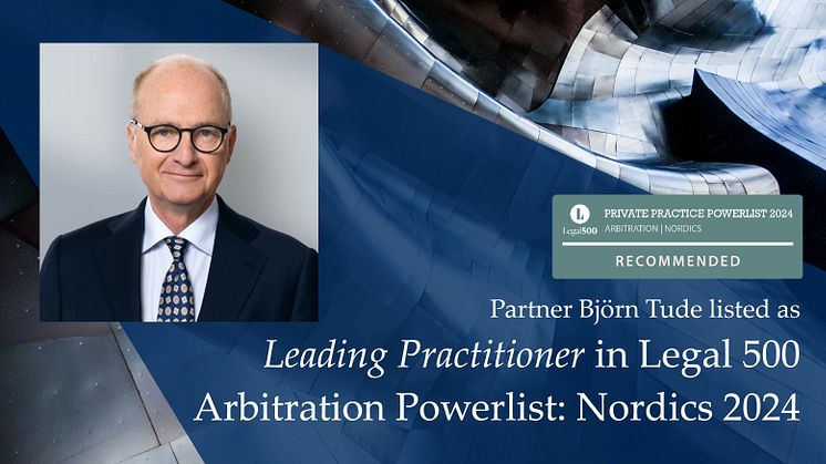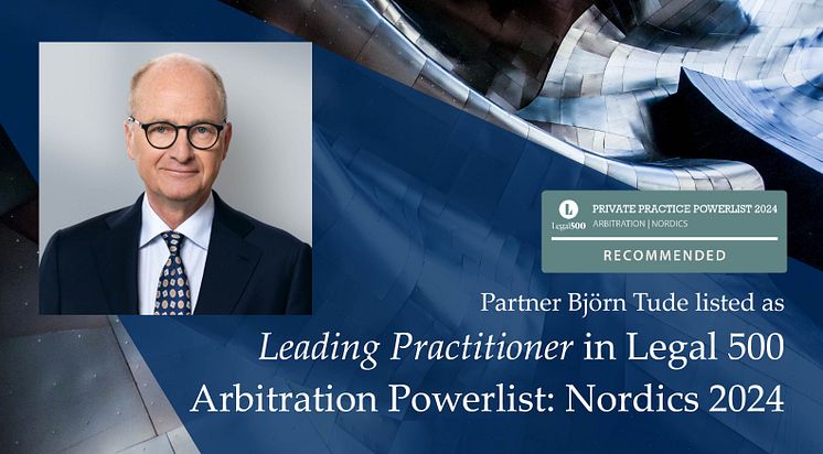 Partner Björn Tude has once again been listed as a leading practitioner in Legal 500 Arbitration Powerlist: Nordics 2024. The guide showcases the leading practitioners working in Sweden, Denmark, Finland, Norway, and Iceland.