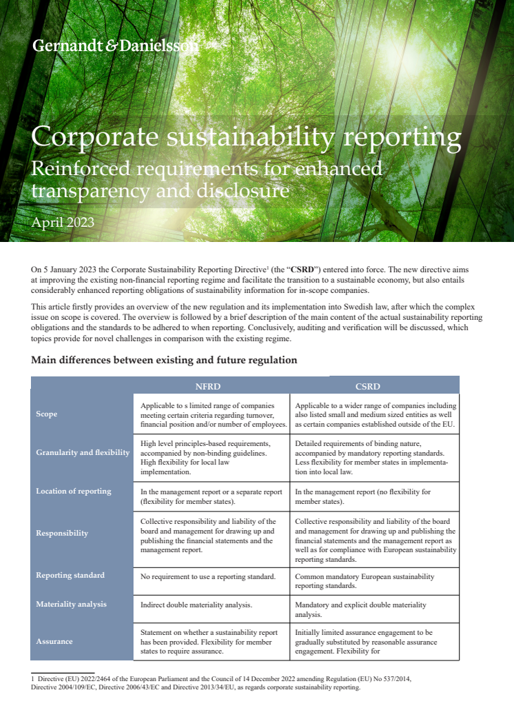 On 5 January 2023 the Corporate Sustainability Reporting Directive (CSRD) entered into force. The new directive aims at improving the existing non-financial reporting regime and facilitate the transition to a sustainable economy, but also entails considerably enhanced reporting obligations of sustainability information for in-scope companies.