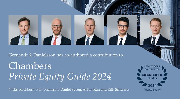 Chambers Private Equity 2024 Guide (Chambers Private Equity 2024) kombinerar rättsliga och regulatoriska perspektiv med praktiska iakttagelser om marknadstrender inom private equity. Publikationen innefattar bidrag från 38 jurisdiktioner och behandlar en bredd av ämnen med relevans för private equity-transaktioner, såsom strukturering av transaktioner, villkor i förvärvsdokumentation, offentliga uppköpserbjudanden, tröskelvärden för budplikt, incitament för ledningen, aktieägartillsyn och ansvar samt exit, inklusive genom en börsintroduktion (IPO). Partners Niclas Rockborn och Pär Johansson, senior associates Daniel Sveen och Arijan Kan samt associate Erik Schwartz, verksamma med fokus inom Gernandt & Danielssons verksamhetsområden corporate/capital markets och specialist och finansiella tjänster, är författare av bidraget till publikationen vad avser Sverige.
