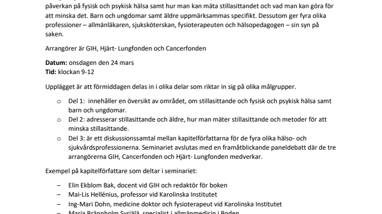 Den 24 mars äger ett digitalt seminarium rum i samband med bokreleasen av uppdateringen av boken ”Långvarigt stillasittande – en hälsofara i tiden”. I tolv kapitel beskrivs området stillasittande, dess påverkan på fysisk och psykisk hälsa samt hur man kan mäta stillasittandet och vad man kan göra för att minska det. Barn och ungdomar samt äldre uppmärksammas specifikt. Dessutom ger fyra olika professioner – allmänläkaren, sjuksköterskan, fysioterapeuten och hälsopedagogen – sin syn på saken.