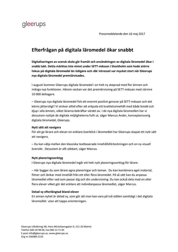 Digitaliseringen av svensk skola går framåt och användningen av digitala läromedel ökar i snabb takt. Detta märktes inte minst under SETT-mässan i Stockholm som hade större fokus på digitala läromedel än tidigare och där intresset var mycket stort när Gleerups nya digitala läromedel premiärvisades.
