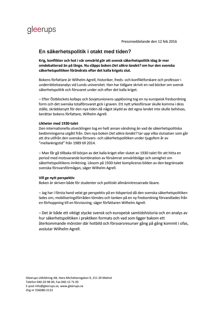 Krig, konflikter och hot i vår omvärld gör att svensk säkerhetspolitik idag är mer omdebatterad än på länge. Nu släpps boken Det säkra landet? om hur den svenska säkerhetspolitiken förändrats efter det kalla krigets slut.