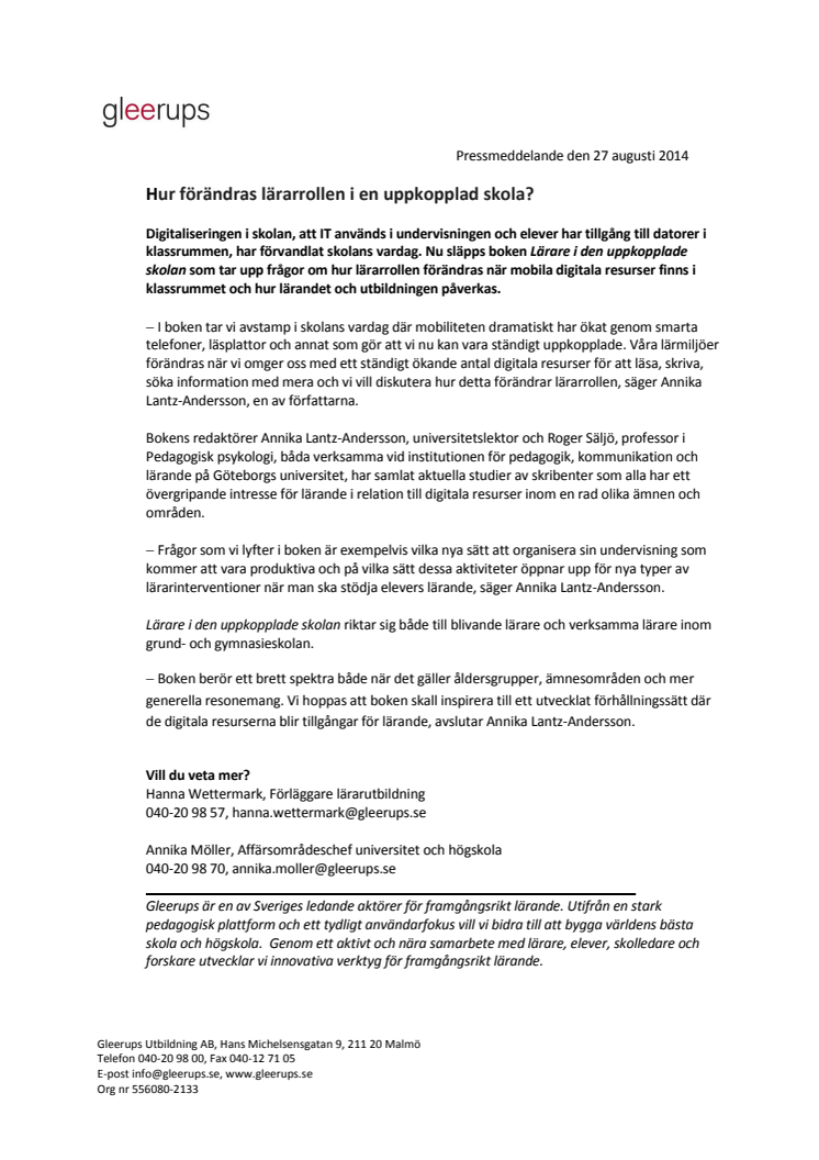 Digitaliseringen i skolan, att IT används i undervisningen och elever har tillgång till datorer i klassrummen, har förvandlat skolans vardag. Nu släpps boken Lärare i den uppkopplade skolan som tar upp frågor om hur lärarrollen förändras när mobila digitala resurser finns i klassrummet och hur lärandet och utbildningen påverkas.