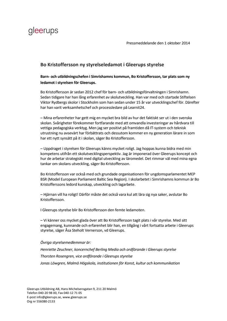 – Vi känner oss mycket glada över att Bo Kristoffersson tagit plats i vår styrelse. Med sitt engagemang, kunnande och erfarenhet blir han en tillgång i vårt fortsatta arbete i Gleerups styrelse, säger Åsa Steholt Vernerson, vd Gleerups.