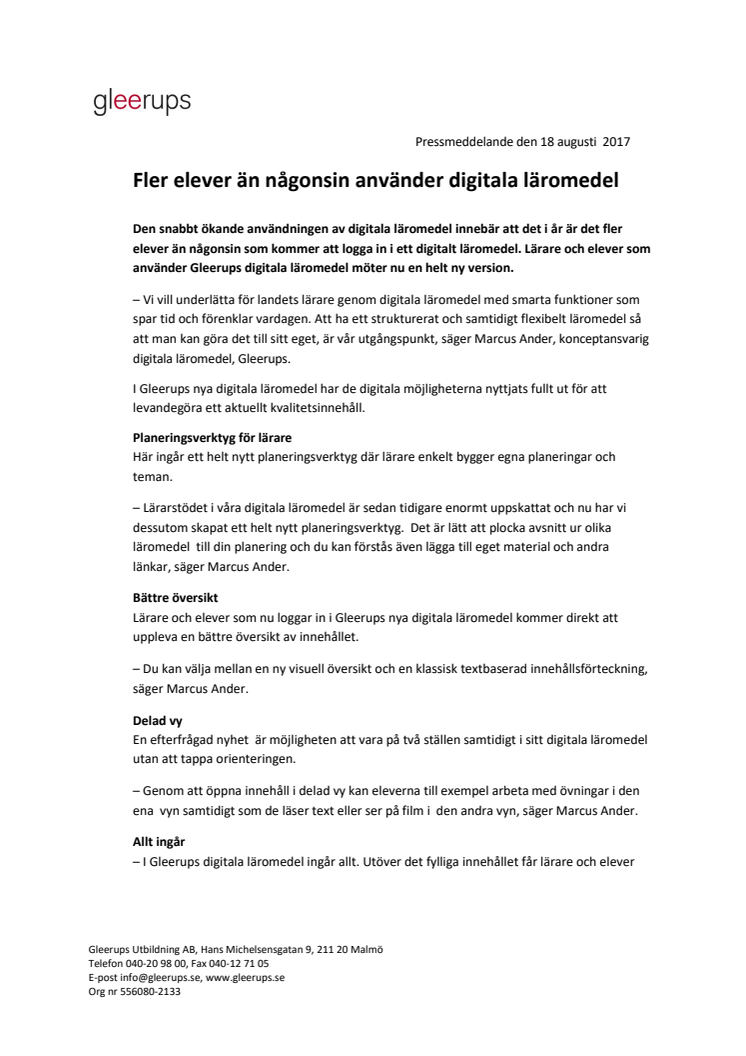 – Arbetet med att utveckla den nya versionen av Gleerups nya digitala läromedel har varit enormt roligt. Den fortsatta utvecklingen tar nu vid och som alltid i nära samarbete med både elever, lärare och skolledare. Det ser vi fram emot, avslutar Marcus Ander.