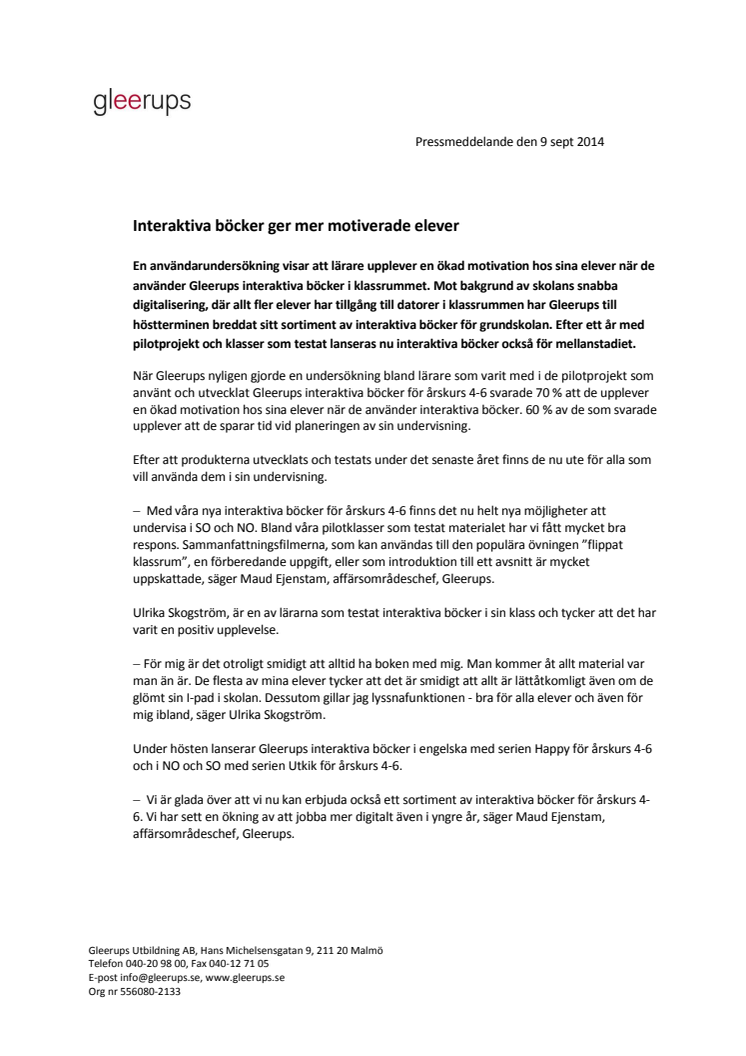 En användarundersökning visar att lärare upplever en ökad motivation hos sina elever när de använder Gleerups interaktiva böcker i klassrummet. Mot bakgrund av skolans snabba digitalisering, där allt fler elever har tillgång till datorer i klassrummen har Gleerups till höstterminen breddat sitt sortiment av interaktiva böcker för grundskolan. Efter ett år med pilotprojekt och klasser som testat lanseras nu interaktiva böcker också för mellanstadiet.