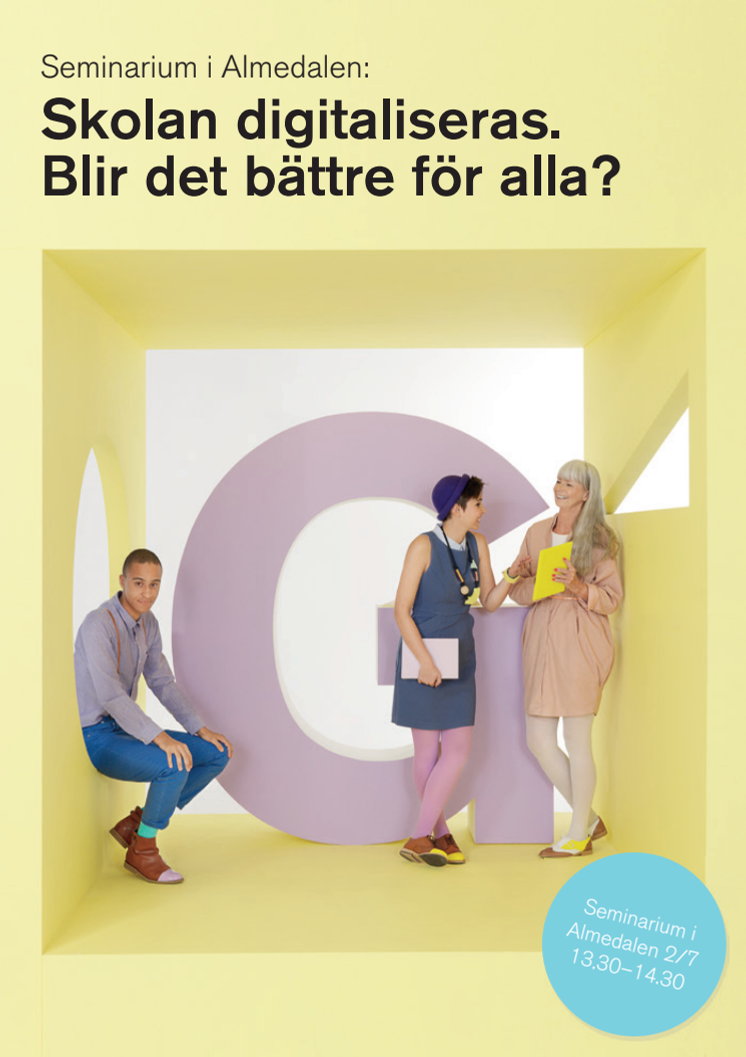 Gleerups seminarium ”Skolan digitaliseras. Blir det bättre för alla? Ett samtal om framtidens lärande och lärverktyg.” hålls ons 2 juli kl 13.30-14.30 i Humordralen, S:t Nicolai kyrkoruin.