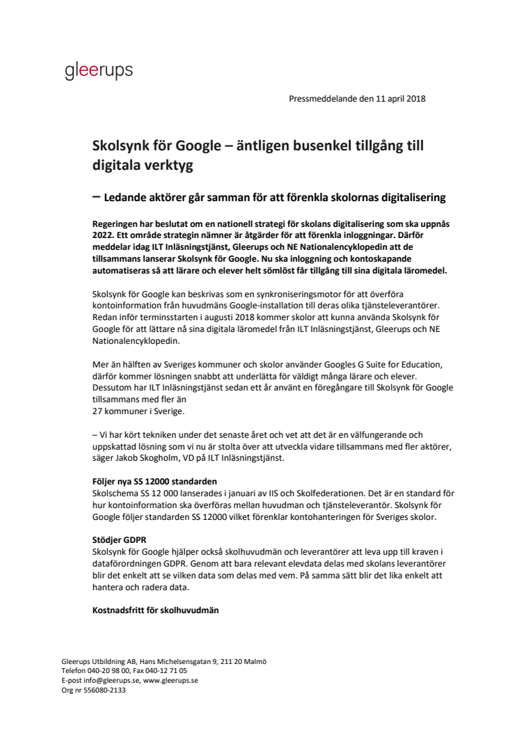 Regeringen har beslutat om en nationell strategi för skolans digitalisering som ska uppnås 2022. Ett område strategin nämner är åtgärder för att förenkla inloggningar. Därför meddelar idag ILT Inläsningstjänst, Gleerups och NE Nationalencyklopedin att de tillsammans lanserar Skolsynk för Google. Nu ska inloggning och kontoskapande automatiseras så att lärare och elever helt sömlöst får tillgång till sina digitala läromedel.