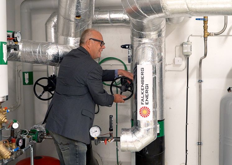 Magnus Hesselmar, fjärrvärmechef på Falkenberg Energi öppnar slussarna till fjärrvärmenätet.