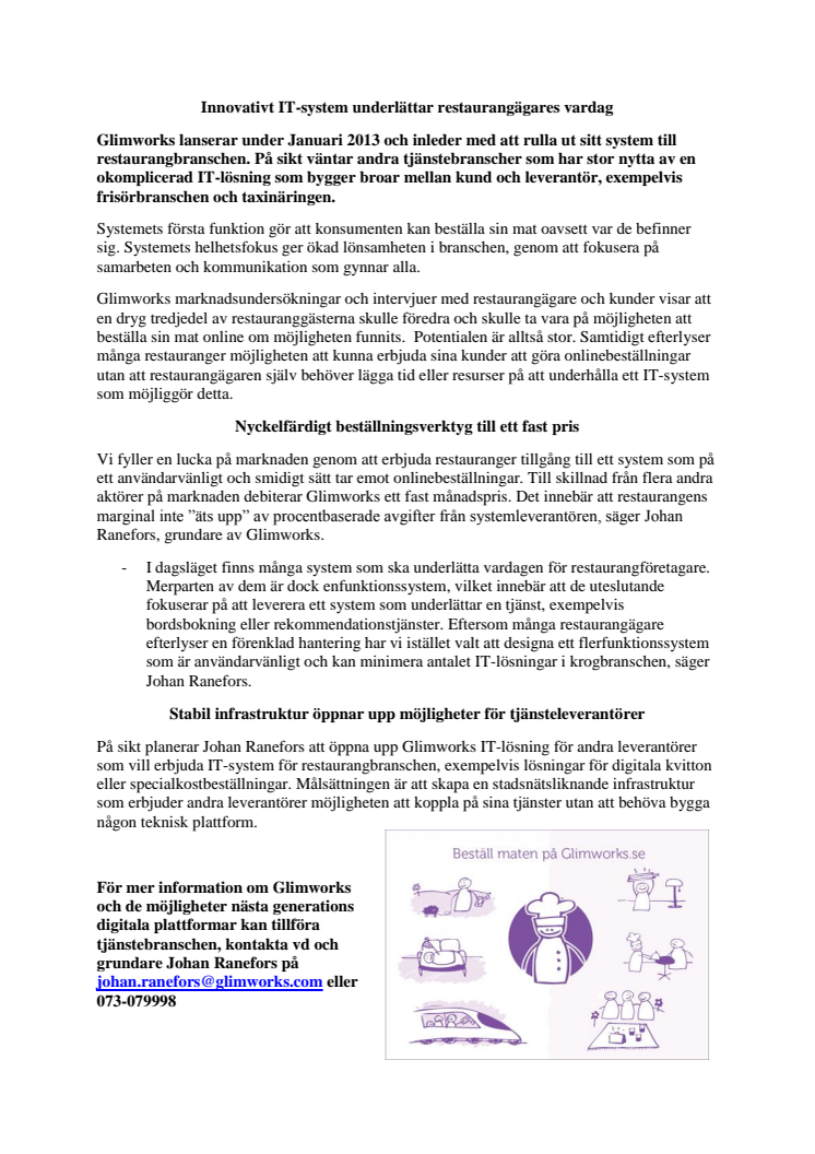 Glimworks lanserar under Januari 2013 och inleder med att rulla ut sitt system till restaurangbranschen. På sikt väntar andra tjänstebranscher som har stor nytta av en okomplicerad IT-lösning som bygger broar mellan kund och leverantör, exempelvis frisörbranschen och taxinäringen.