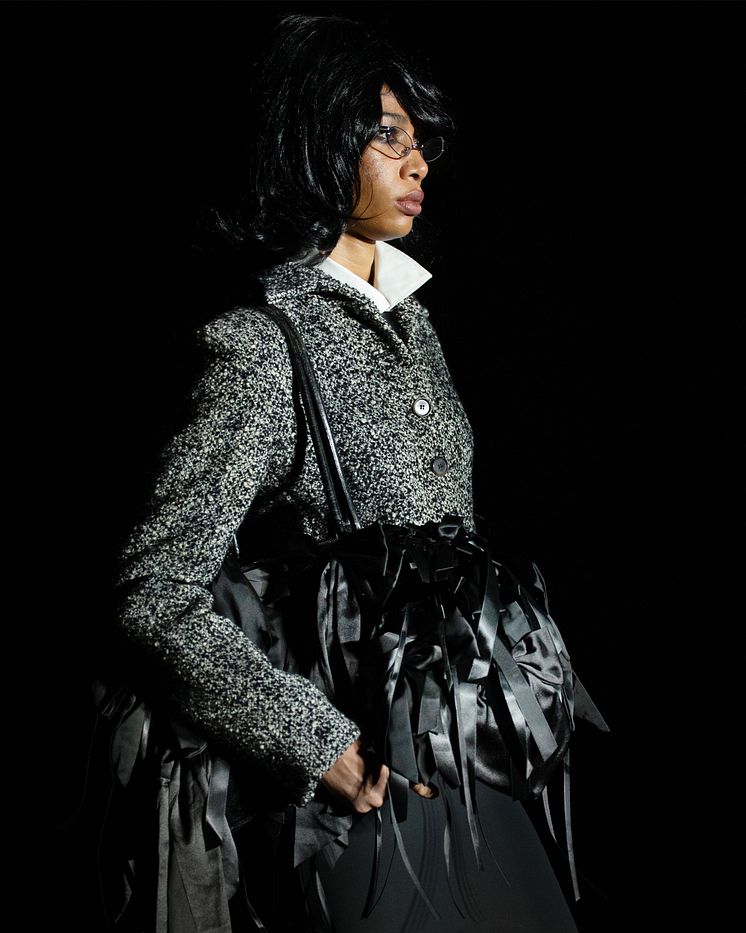 Modellerna blev stylade med smycken och överdimensionerade satinsrosetter, som skapade en dynamisk kontrast mellan skörhet och styrka. En av visningens showlooks var en weekendväska draperad i Glitters satinsrosetter, ett lekfullt och extravagant inslag som gav ytterligare lager till kollektionens narrativ. Som en sista touch fick gästerna med sig utvald accessoar och smycke från Glitter – en påminnelse om showens gränsöverskridande budskap.