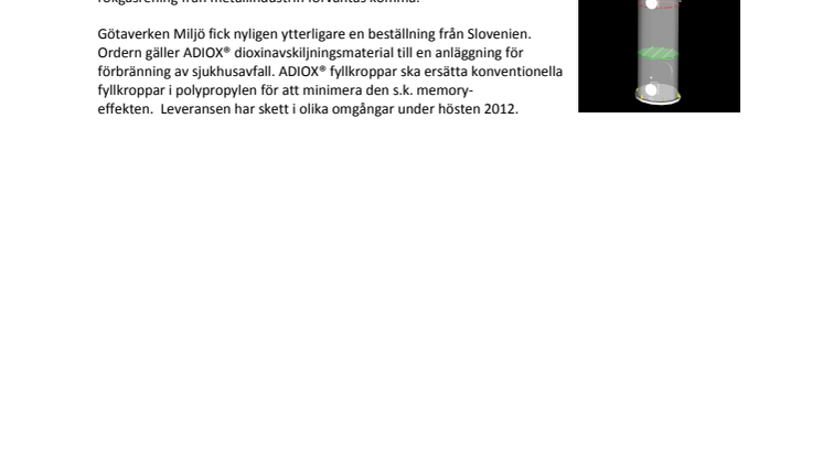 Götaverken Miljö fick nyligen ytterligare en beställning från Slovenien. Ordern gäller ADIOX® dioxinavskiljningsmaterial till en anläggning för förbränning av sjukhusavfall. ADIOX®-fyllkroppar ska ersätta konventionella fyllkroppar i polypropylen för att minimera den s.k. memory-effekten. Leveransen har skett i olika omgångar under hösten 2012.