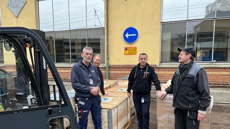 Fr v: Morgan Nilsen – Göteborgs spårvägar, Martin Söderlund från hjälporganisationen, Özcan Yilmaz – verkstadschef Rantorget samt Kurt Turesson från hjälporganisationen. (Foto: Göteborgs Spårvägar)