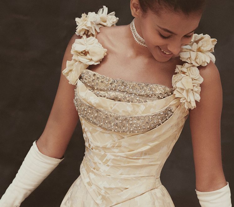 Augusta Lundin, balklänning i guldsilver-mönster, med grå tyll vid urringningen, 1904, privat ägo. Foto Ewa-Marie Rundquist.