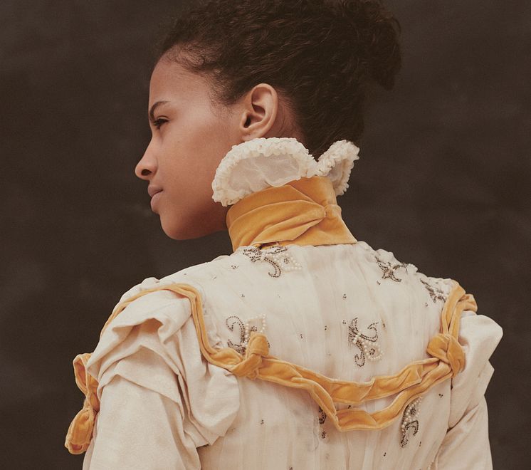 Nästan renässanskänsla: stramt höghalsat klänningsliv i vitt atlassiden med övre lager av mönstertryckt chiffong broderat med strass. Midjeband och ståndkrage är klätt med orange flox som återkommer i garneringar och blomformade rosetter på både livet och kjolen. Innanför kragen syns tyll kantat med rysch som formas likt ett hjärta med hjälp av att en metalltråd är insydd i övre kanten. 1890-tal.