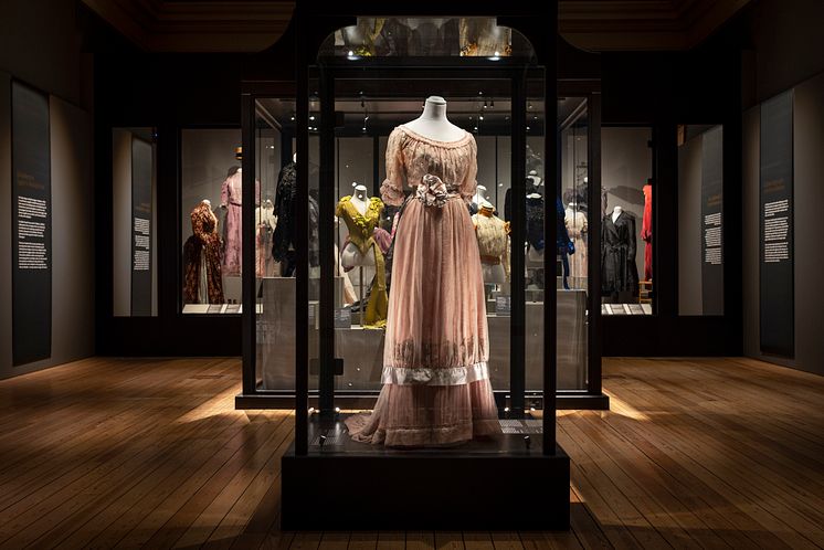 I förgrunden: Aftonklänning från 1908 i tubmodell, av blekrosa sidenrips under rökfärgad sidenchiffong med broderier av glaspärlor och snäckskal på livet. Kantningar och midjeband i satin, modell från Worth. Buren av stamkunden Anna Beck-Friis (1866–1950) från Söderö. Privat samling. Augusta Lundin köpte förlagor/toiler av Worth och ägde därmed rättigheter att sy upp modeller, vilket hon var först med i Sverige. Anna Beck-Friis, vars make kammarherren alltid ville att hon skulle vara till sitt bästa, var en stamkund som väljer modeller från Worth och favoriserar det spektakulära. Ett tilltalande exempel på vad hela den här utställningen handlar om, med skickligt hantverk, modekänsla och tidsanda.