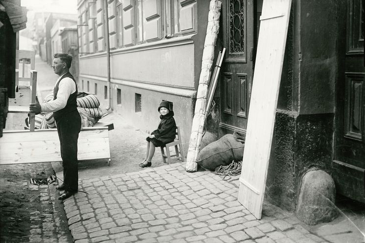 En familj i Olskroken packar sitt flyttlass efter att de blivit vräkta p.g.a. den hyresstrejk som många familjer deltog i under 1929. De strejkade för att hyrorna var för höga i förhållande till lägenheternas standard.
