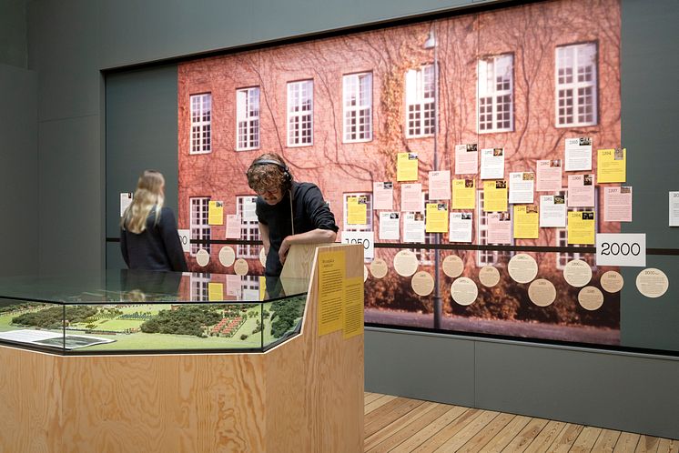 Modell över Lillhagens sjukhus och en kronologisk tidslinje över institutionens historia.
