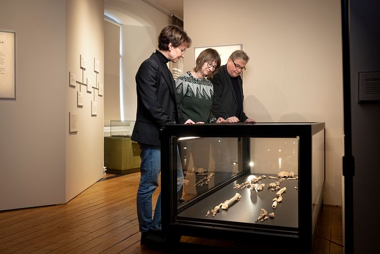 Fr vä: Museichef Carina Sjöholm, Stadsmuseets arkeolog och antikvarie Else-Britt Filipsson och osteolog Torbjörn Ahlström från Lunds universitet vid Österödskvinnans monter.