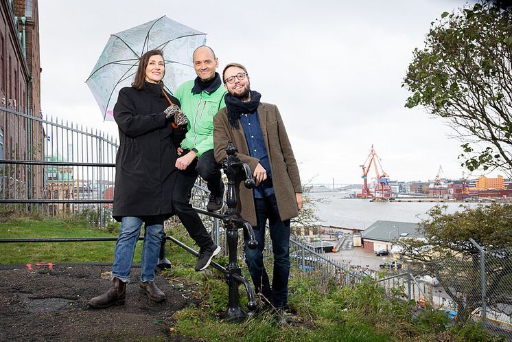 Ylva Berglund, antikvarie, Håkan Strömberg, pedagog och historiker, och Kristian Jonsson, bebyggelseantikvarie, är programledare för podden "En kvart om Göteborg"