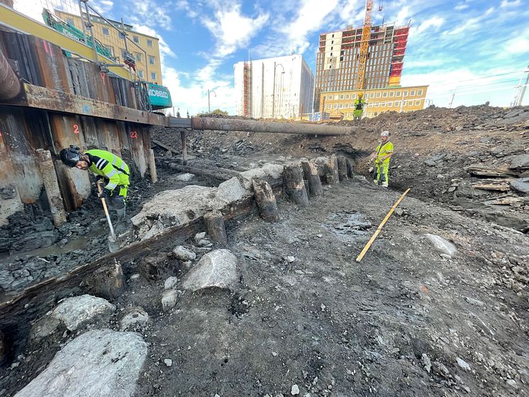 Utgrävningsplatsen vid kvarteret Röda Bryggan, mellan Järntorget och Esperantoplatsen. Här syns vägbankens norra del som ledde in till 1600-talets Göteborg.