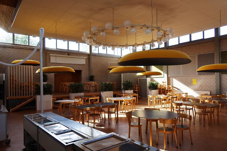 Den ursprungliga aulan, idag matsal, är till stora delar bevarad i ursprungligt utförande.