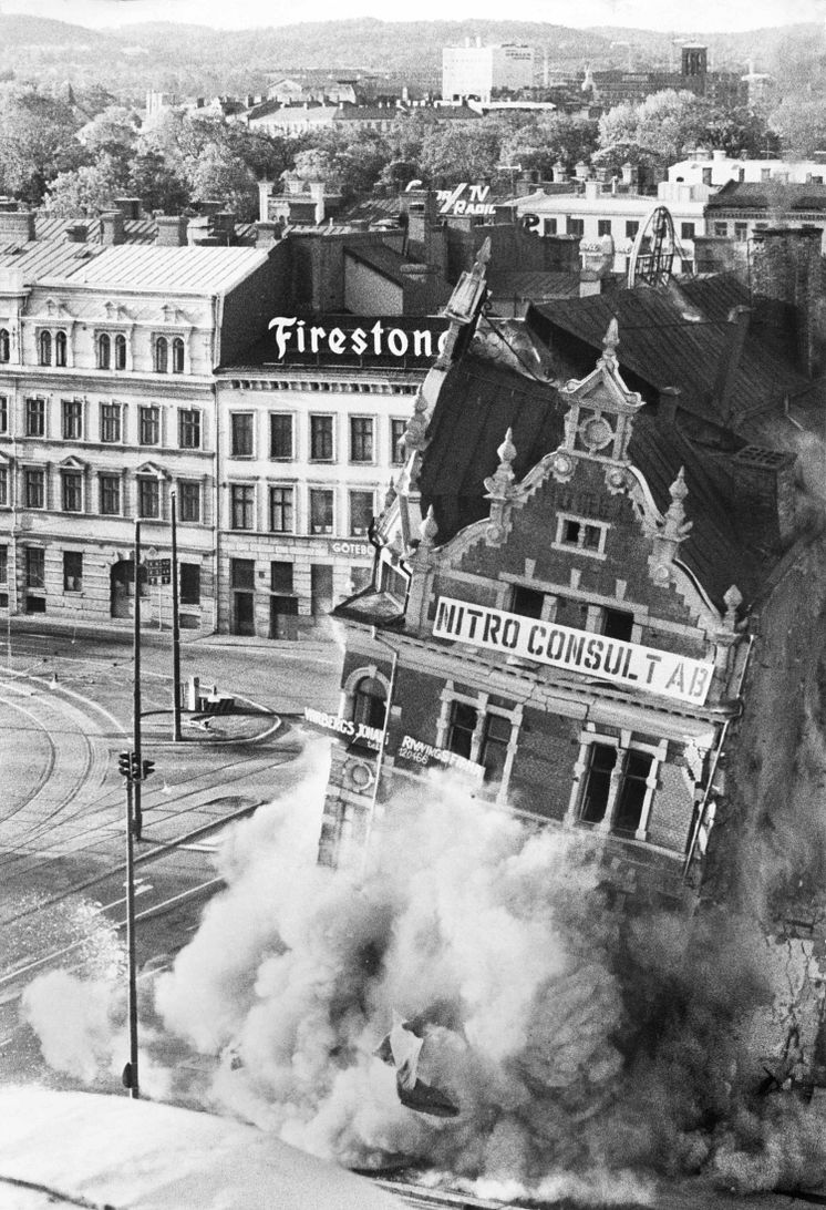 Sprängning på lördagsmorgonen den 13 juni 1970. Huset på Nils Ericsonsgatan 19 vid Drottningtorget var byggt 1891 som hotell, först Hotel D’Angleterre och senare Hotel Continental. 1949 flyttade SKF:s flickhem in men från mitten av 1950-talet huserade Bilspeditions huvudkontor i byggnaden. Fotograf okänd. Bildkälla: Göteborgs stadsmuseum, Hjörnearkivet.