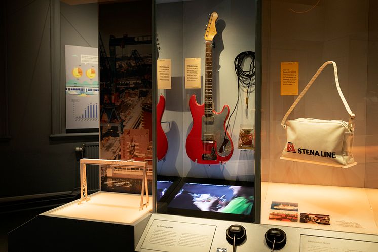 Till vänster visas en elgitarr och en "semperfajser" - en specialbyggd förstärkare, som användes av göteborgsartisten Sillstryparn, bland annat vid en festival 1975 som kritiserade Melodifestivalen. Till höger en väska från Stena Line, På 1960-talet startade Stena Line billiga kryssningar till Danmark. De blev både älskade och kritiserade, för på färjan fanns spelautomater, och folk kunde dricka öl mitt på dagen.