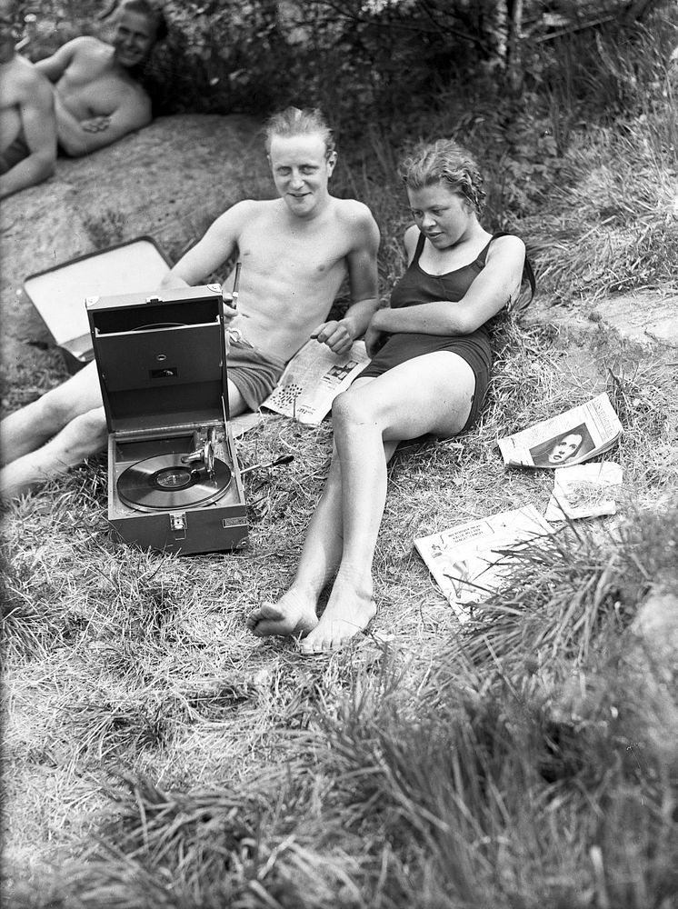 Ungt par med resegrammofon vid Härlanda Tjärn i juni 1940. Här anlades den första badplatsen med badvakt i Delsjöområdet 1932. Fotograf okänd. Bildkälla: Göteborgs stadsmuseum, Hjörnearkivet.