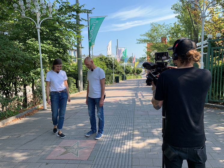 Ylva Berglund och Håkan Strömberg under inspelningen av "Hur hamnade vi här? - tio filmer om Göteborgs historia". Foto: Emma Backman