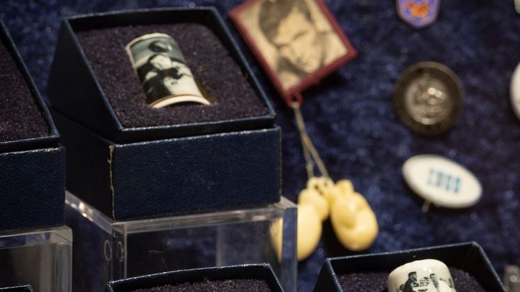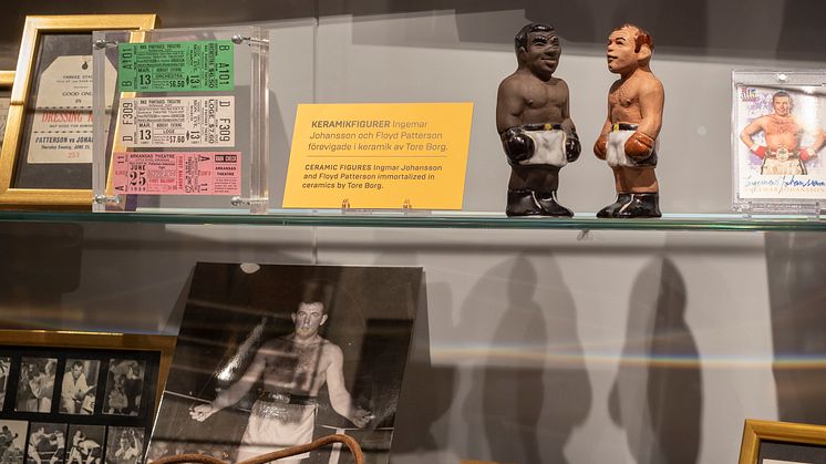 Delar av Stefan Tolinssons Ingo-samling. Överst syns bland annat Ingemar Johansson och Floyd Patterson förevigade i keramik av Tore Borg. På mittenhyllan tronar Ingos hopprep. I montern finns också Dogge Doggelitos singel "Hårda papper" som är en hyllning till Ingo. Foto: Kristin Lidell