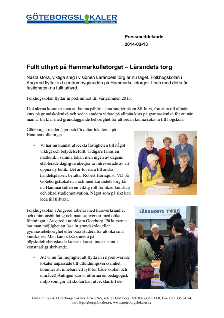 Nästa stora, viktiga steg i visionen Lärandets torg är nu taget. Folkhögskolan i Angered flyttar in i centrumbyggnaden på Hammarkulletorget. I och med detta är fastigheten nu fullt uthyrd. Folkhögskolan flyttar in preliminärt till vårterminen 2015.