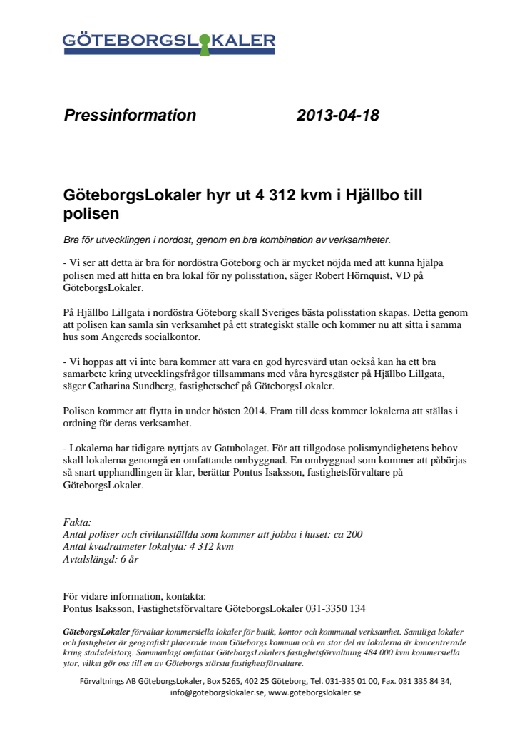 GöteborgsLokaler hyr ut 4 312 kvm i Hjällbo till polisen
