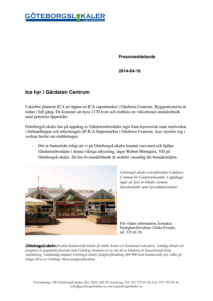 I oktober planerar ICA att öppna en ICA supermarket i Gårdsten Centrum. Byggnationerna är redan i full gång. De kommer att hyra 1170 kvm och etablera en välsorterad områdesbutik med generösa öppettider. GöteborgsLokaler har på uppdrag av Gårdstensbostäder tagit fram hyresavtal samt medverkat i förhandlingen och uthyrningen till ICA Supermarket i Gårdsten Centrum.