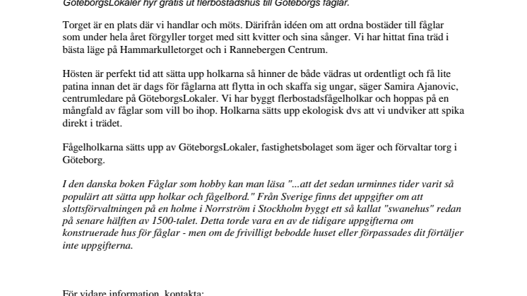 I dessa tider av bostadsbrist och färglösa fasader erbjuder GöteborgsLokaler nu ett antal färgglada nybyggda bostäder vid Hammarkulletorget och i Rannebergen Centrum. Och inte för vem som helst, utan för hyresgäster som förgyller torgen med sitt kvitter och sina sånger. GöteborgsLokaler hyr gratis ut flerbostadshus till Göteborgs fåglar.