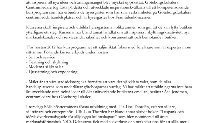 På senhösten 2008 anordnade GöteborgsLokaler två inspirationskvällar med tema julskyltning för att inspirera till nya idéer och arrangemanget blev mycket uppskattat. GöteborgsLokalers Centrumledare tog fasta på detta och utvecklade inspirationskvällarna till ett kompetensökande kursprogram som har erbjudits de hyresgäster som har sina verksamheter på GöteborgsLokalers centrumledda handelsplatser och är hyresgäster hos Framtidenkoncernen.