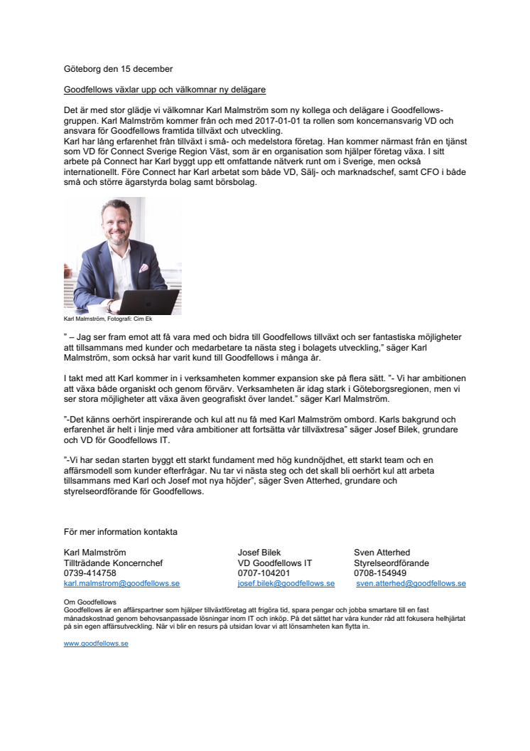 Goodfellows växlar upp och välkomnar ny delägare och ny koncernchef from 1 januari 2017. Verksamheten har under de senaste åren haft en spännande och framgångsrik tillväxtresa och nu tar vi nästa steg och tar in en ny delägare och kollega som kommer ansvara för bolagets framtida tillväxt.