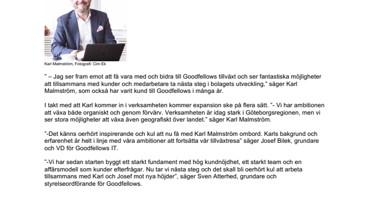 ”-Det känns oerhört inspirerande och kul att nu få med Karl Malmström ombord. Karls bakgrund och erfarenhet är helt i linje med våra ambitioner att fortsätta vår tillväxtresa” säger Josef Bilek, grundare och VD för Goodfellows IT.