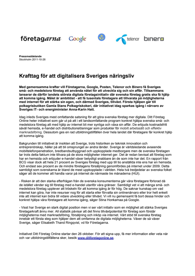 Med gemensamma krafter vill Företagarna, Google, Posten, Telenor och Binero få Sveriges små- och medelstora företag att använda nätet för att utveckla sig och sin affär. Tillsammans lanserar de därför landets största digitala företagsinitiativ där svenska företag gratis ska få hjälp att komma igång.