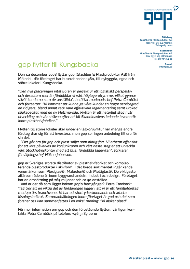 Den 1:a december 2008 flyttar Glasfiber & Plastprodukter Sveriges största distributör av plasthalvfabrikat från Mölndal, där företaget har huserat sedan 1980, till nybyggda, egna och större lokaler i Kungsbacka.