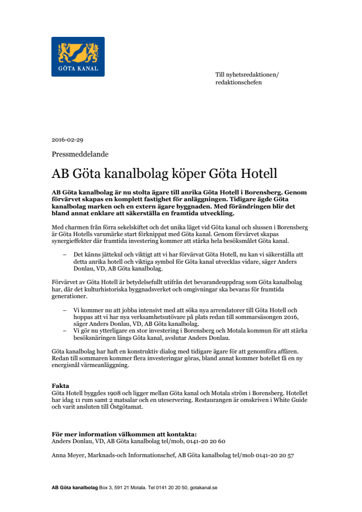 AB Göta kanalbolag är nu stolta ägare till anrika Göta Hotell i Borensberg. Genom förvärvet skapas en komplett fastighet för anläggningen. Tidigare ägde Göta kanalbolag marken och en extern ägare byggnaden. Med förändringen blir det bland annat enklare att säkerställa en framtida utveckling.